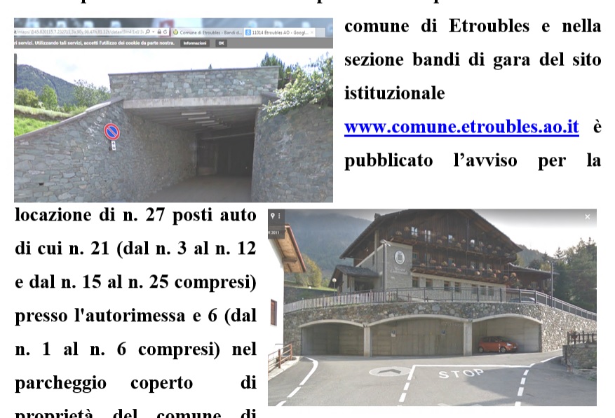 Il segretario comunale rendo noto che il Comune di Etroubles intende concedere in locazione di n. 21 posti auto (dal n. 3 al n. 12 e dal n. 15 al n. 25 compresi) nell’autorimessa di proprietà comunale, sita nel Comune di Etroubles, in ruelle Millet n. 20, censito al N.C.E.U. al Fg. 17, mappale n. 166, sub. 7, e di n. 6 posti auto (dal n. 1 al n. 6 compresi) nel parcheggio coperto di proprietà comunale, sito nel Comune di Etroubles, in rue de La Tour, censito al Catasto Terreni al Fg. 17, mappale n. 1328. La durata della locazione è fissata per il periodo dal 01.10.2023 al 30.09.2026. Per partecipare alla gara gli interessati dovranno far pervenire al Comune di Etroubles – Rue de La Tour n. 1, tramite servizio postale, posta elettronica, fax ovvero consegna a mano, entro le ore 12.00 del giorno 15 settembre 2023, a pena di esclusione dalla procedura di assegnazione, una istanza di ammissione alla procedura redatta in carta semplice, contenente gli estremi di identificazione dell’offerente, compreso Codice Fiscale, debitamente sottoscritta dall’interessato, con allegata fotocopia di un valido documento di riconoscimento dello stesso; l’istanza dovrà essere formulata utilizzando preferibilmente l’apposito Modello “Allegato A”, scaricabile dal sito internet del Comune oppure da ritirare presso lo stesso Comune